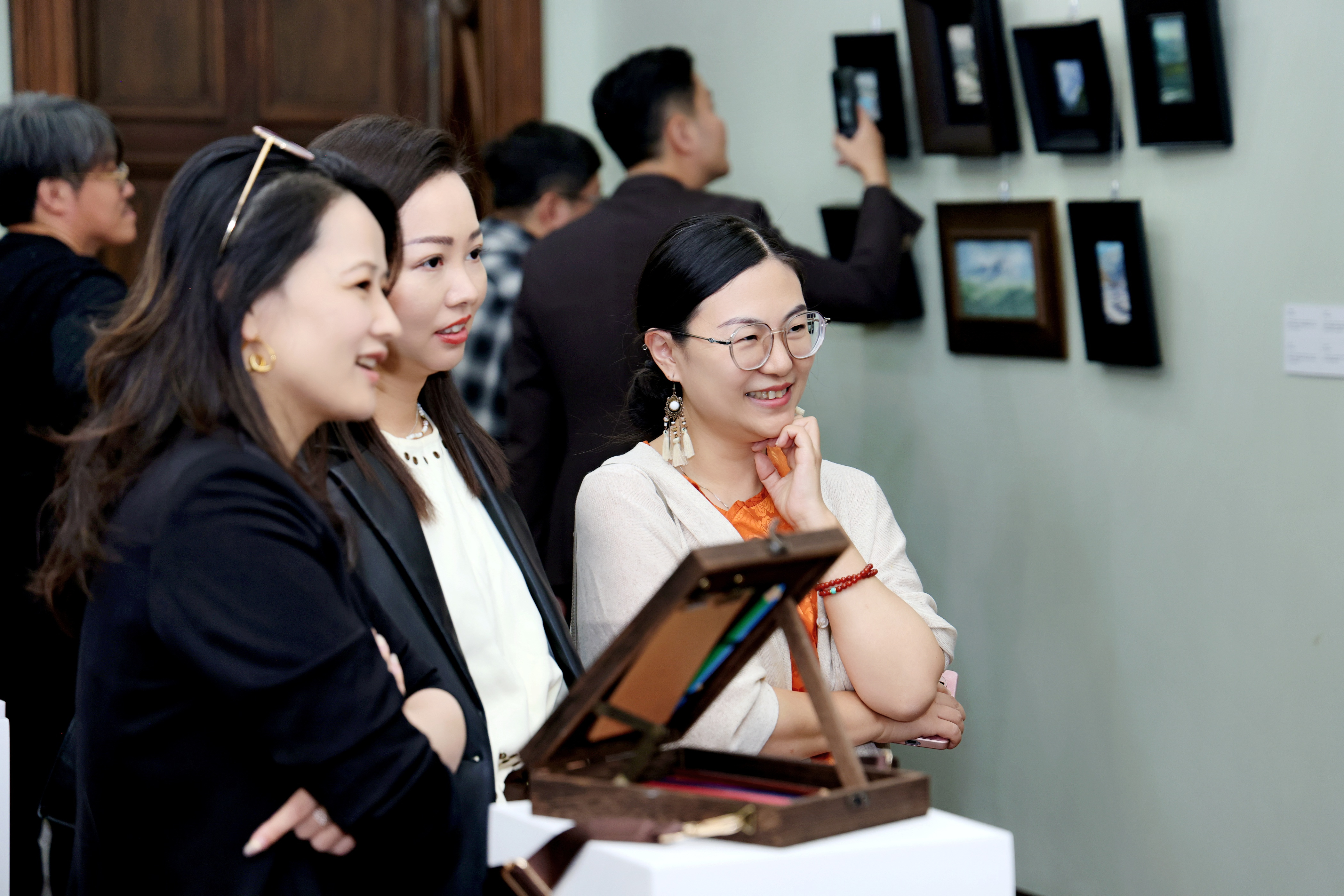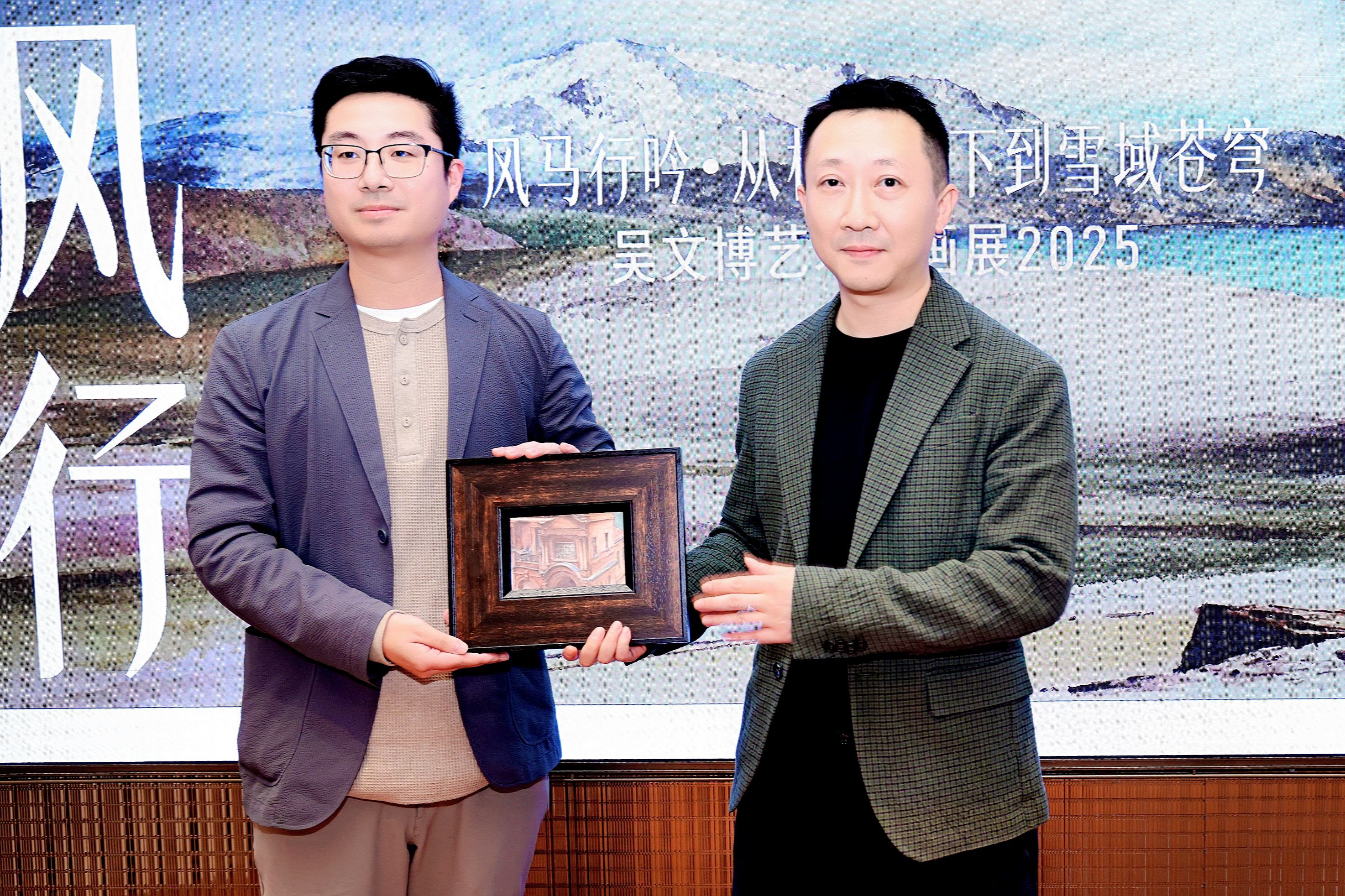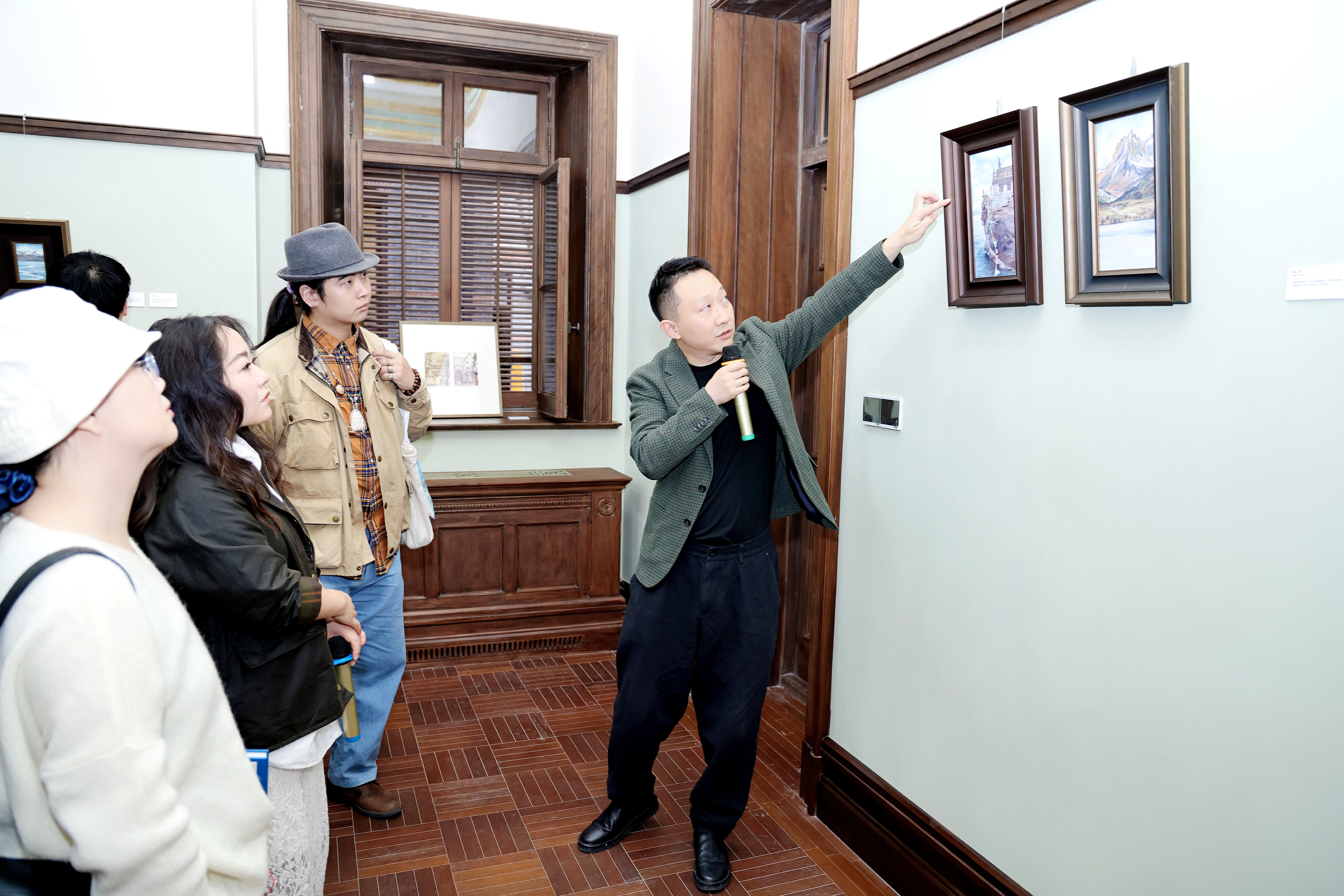 合影留念后,嘉宾们跟从吴文博先生的脚步敞开展厅导览。在艺术家的生动讲解下,西北的苍莽广阔、颜色的细腻流通跃然眼前,让每一位参观者都沉溺式感受着天然与艺术的魅力。 当海派的精美遇上西部的苍莽,当百年修建的寂静与艺术家的灵动相遇,空间不再仅仅物理的容器,更成为精力共识的载体。观者步入其间,恍若穿越时空,在“梧桐树下”与“天穹之上”之间自在周游,收成一次可贵的心灵洗礼。